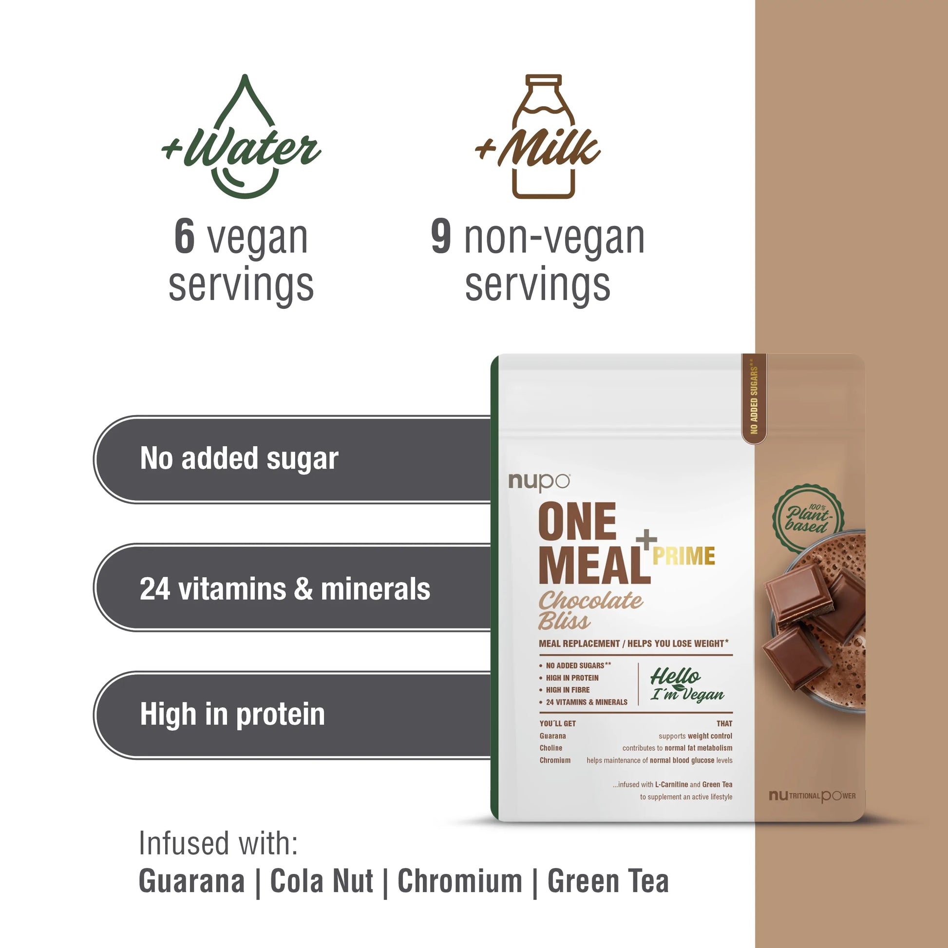 Nupo One Meal +Prime Vegan - Čokoláda je 100% vegan náhrada jedla v prášku s účinnými zložkami z prírodných zdrojov podporujúce chudnutie - bez pridaných cukrov! Obsahuje zmes rastlinných bielkovín, vrátane všetkých esenciálnych aminokyselín. Okrem toho má vysoký obsah vlákien a účinných látok z prírodných zdrojov, ktoré podporujú váš metabolizmus a chudnutie. Spolu s 24 životne dôležitými vitamínmi a minerálmi obsahuje aj zmesi starostlivo triedených zložiek Guarana, Cola Nut, Chróm-u a zeleného čaju. Používa sa ako náhrada jedla dvakrát denne v kombinácii s diétou, ktorá má obmedzený obsah energie. Neobsahuje aspartám. * Nahradenie jedného denného jedla s diétnou porciou Nupo, ktorá má obmedzený obsah energie prispieva k udržaniu hmotnosti po chudnutí. Nahradenie dvoch denných jedál s diétnou porciou Nupo, ktorá má obmedzený obsah energie prispieva k úbytku hmotnosti. Je dôležité však zachovať pestrú a vyváženú stravu a zdravý životný štýl. S Nupo One Meal sme vytvorili zdravé, chutné a úplné nutričné jedlo s nízkym obsahom kalórií, ktoré si môžete vziať aj na cesty. Obsahuje všetky bielkoviny, vlákniny, vitamíny a minerály, ktoré potrebujete. Skutočné nízkokalorické jedlo, ktoré má len približne 200 kalórií. Nupo One Meal tyčinky, nápoje a palacinky sú ideálne na rušné dni, tréningy a na udržanie príjmu kalórií. Keď sme zaneprázdnení, máme tendenciu sa pozabudnúť a obrátiť sa na nezdravé riešenie. Nupo One Meal je tá správna voľba.