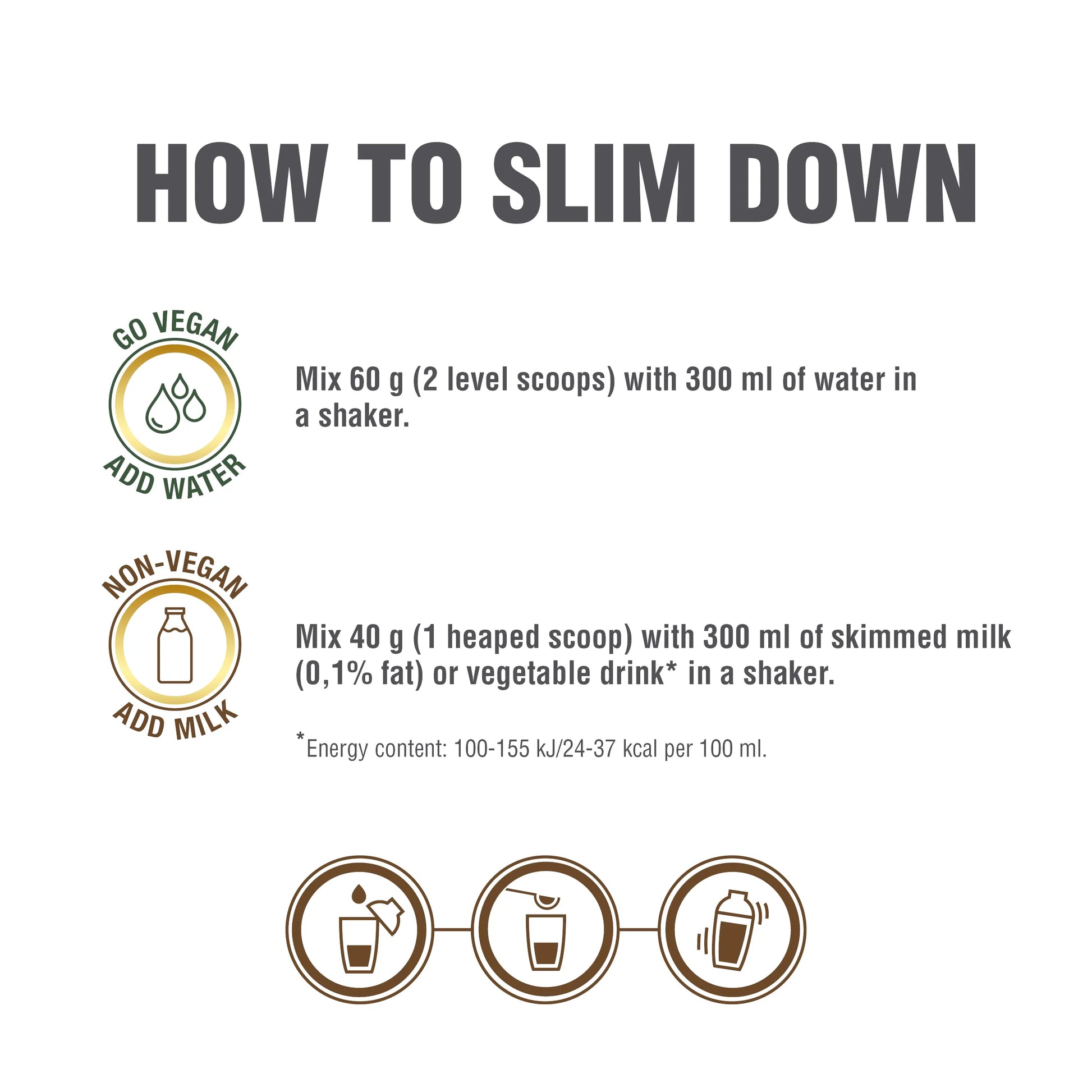 Nahradenie jedného denného jedla pri nízkoenergetickej diéte náhradou jedla prispieva k udržaniu hmotnosti po schudnutí. / Nahradenie dvoch denných jedál pri nízkoenergetickej diéte náhradami jedla prispieva k zníženiu hmotnosti. Dôležité je udržiavať pestrú a vyváženú stravu a zdravý životný štýl.