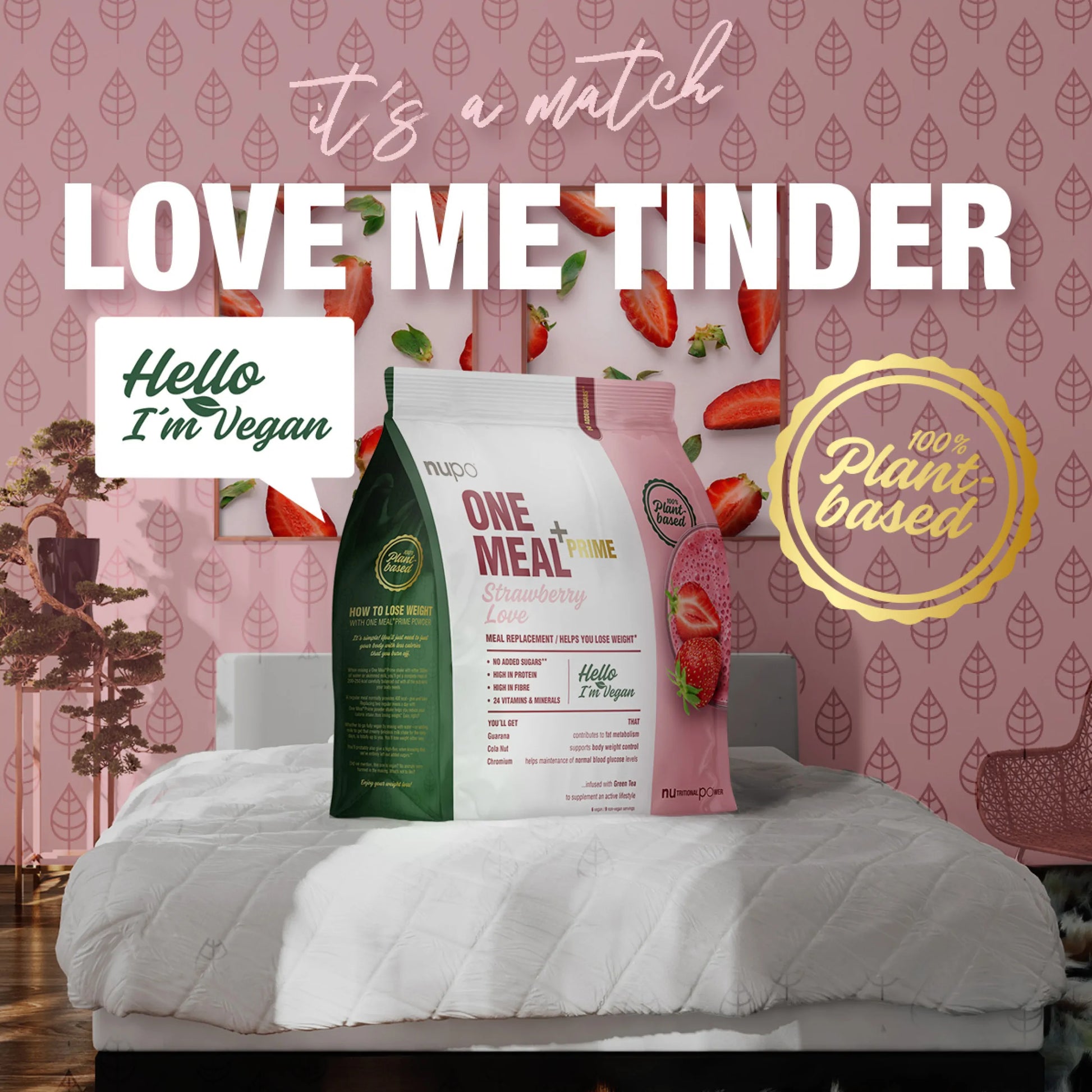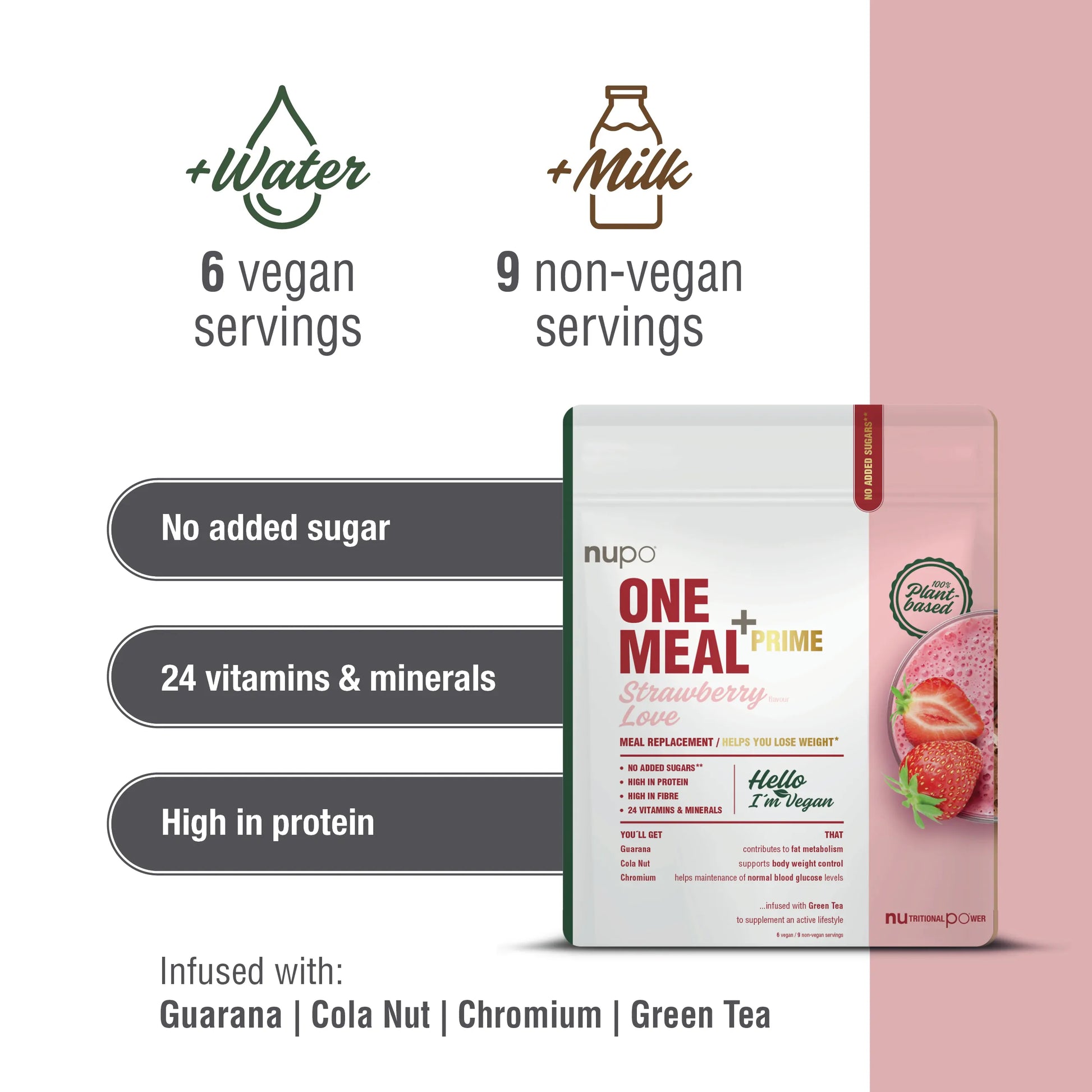 Nupo One Meal +Prime Vegan - Jahoda je 100% vegan náhrada jedla v prášku s účinnými zložkami z prírodných zdrojov podporujúce chudnutie - bez pridaných cukrov! Obsahuje zmes rastlinných bielkovín, vrátane všetkých esenciálnych aminokyselín. Okrem toho má vysoký obsah vlákien a účinných látok z prírodných zdrojov, ktoré podporujú váš metabolizmus a chudnutie. Spolu s 24 životne dôležitými vitamínmi a minerálmi obsahuje aj zmesi starostlivo triedených zložiek Guarana, Cola Nut, Chróm-u a zeleného čaju. Používa sa ako náhrada jedla dvakrát denne v kombinácii s diétou, ktorá má obmedzený obsah energie. Neobsahuje aspartám. * Nahradenie jedného denného jedla s diétnou porciou Nupo, ktorá má obmedzený obsah energie prispieva k udržaniu hmotnosti po chudnutí. Nahradenie dvoch denných jedál s diétnou porciou Nupo, ktorá má obmedzený obsah energie prispieva k úbytku hmotnosti. Je dôležité však zachovať pestrú a vyváženú stravu a zdravý životný štýl. S Nupo One Meal sme vytvorili zdravé, chutné a úplné nutričné jedlo s nízkym obsahom kalórií, ktoré si môžete vziať aj na cesty. Obsahuje všetky bielkoviny, vlákniny, vitamíny a minerály, ktoré potrebujete. Skutočné nízkokalorické jedlo, ktoré má len približne 200 kalórií. Nupo One Meal tyčinky, nápoje a palacinky sú ideálne na rušné dni, tréningy a na udržanie príjmu kalórií. Keď sme zaneprázdnení, máme tendenciu sa pozabudnúť a obrátiť sa na nezdravé riešenie. Nupo One Meal je tá správna voľba.